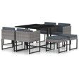 This trendy 8-person garden dining set, featuring an elegant and modern design, is meant to be the focal point of your garden or patio! The dining set, made of weather-resistant PE rattan and tempered glass, is easy to clean with a damp cloth. The steel frames add to the sturdiness. Thanks to their lightweight constructions, the set is easy to move around. The thick, soft cushions with cotton fibre filling are highly comfortable. The covers, equipped with zips, are easily removable and washable. Additionally, the stools can be placed neatly underneath the table when not in use to save space. Note: We recommend covering the set in the rain, snow, and frost for longlasting life.