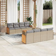 This garden sofa set is the perfect addition to your backyard, terrace, or patio, providing a comfortable and inviting space for chatting with family and friends or simply relaxing and enjoying the outdoors. Durable material: PE rattan, also known as poly rattan, is a strong, low-maintenance synthetic material that looks like natural rattan. It's lightweight, easy to clean, and commonly used for outdoor furniture due to its durability and weather-resistant properties.Comfortable seat experience: This outdoor furniture, complete with thickly padded cushions, offers a comfortable seating experience.Stable and easy-to-clean tabletop: This garden table has an acacia wood top that is sturdy, durable, and easy to clean with a damp cloth.Removable and washable cover: These seat cushions feature removable covers for easy washing and maintenance.Modular design: This outdoor furniture set has a modular design, making it completely flexible and easy to move around, so you can create a customised outdoor furniture arrangement. Good to know:To make sure your outdoor furniture stays beautiful, we recommend protecting it with a waterproof cover.