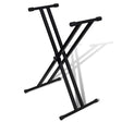 This X-frame double braced keyboard stand, which is made of rugged steel, is ideal for bands, performance teams and other music lovers. Built with heavy duty square tube construction, this keyboard stand is designed to support your keyboard for many years, suitable for larger keyboard instruments. With 5 different working heights adjustable, this stand could be easily set at a desired height with fundamental stability, thanks to the circular locking mechanism. Anti-slip rubber end caps not only protect your floor from scratches, but also provide an added base support. The foldable design brings easy portability and better storage.