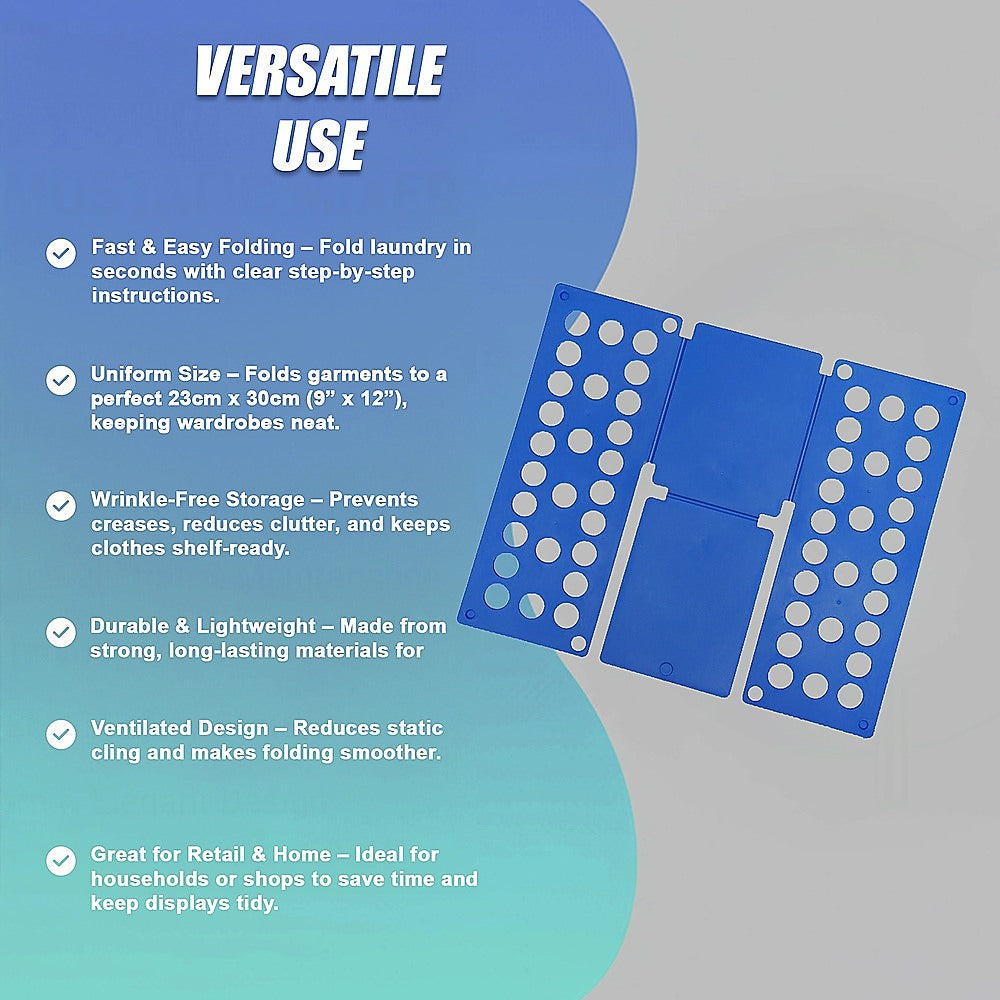 Keep your wardrobe neat and wrinkle-free with this Adult Clothes Folder Organiser. Designed to fold clothes quickly, evenly, and to a uniform size, it makes laundry faster and more efficient. Perfect for home use, retail stores, or anyone looking for a simple way to achieve a perfectly organised wardrobe.