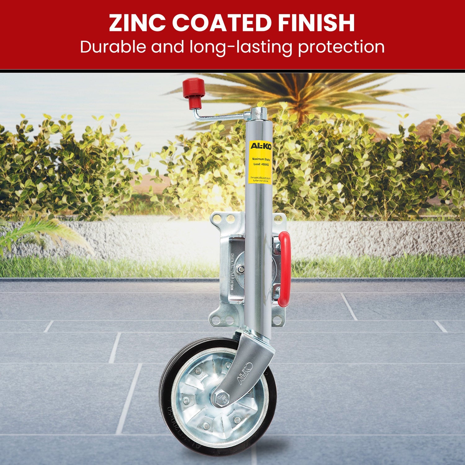 The durable wheel can easily roll through soft or uneven surfaces, while the angled tube stops any rotation when stowed. Whats more, the zinc-coated design ensures long-lasting durability. Its a practical, reliable solution thatll make your towing experience smoother and easier!