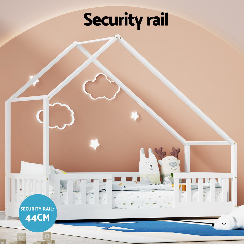 Introducing our whimsical house-shaped bed frame, crafted from solid pine wood for ultimate durability. Designed with kids in mind, it features safe, non-toxic paint, smooth edges, and sturdy construction. Easy to maintain and fitting a standard Australian Single mattress, it's the perfect addition to any child's bedroom.