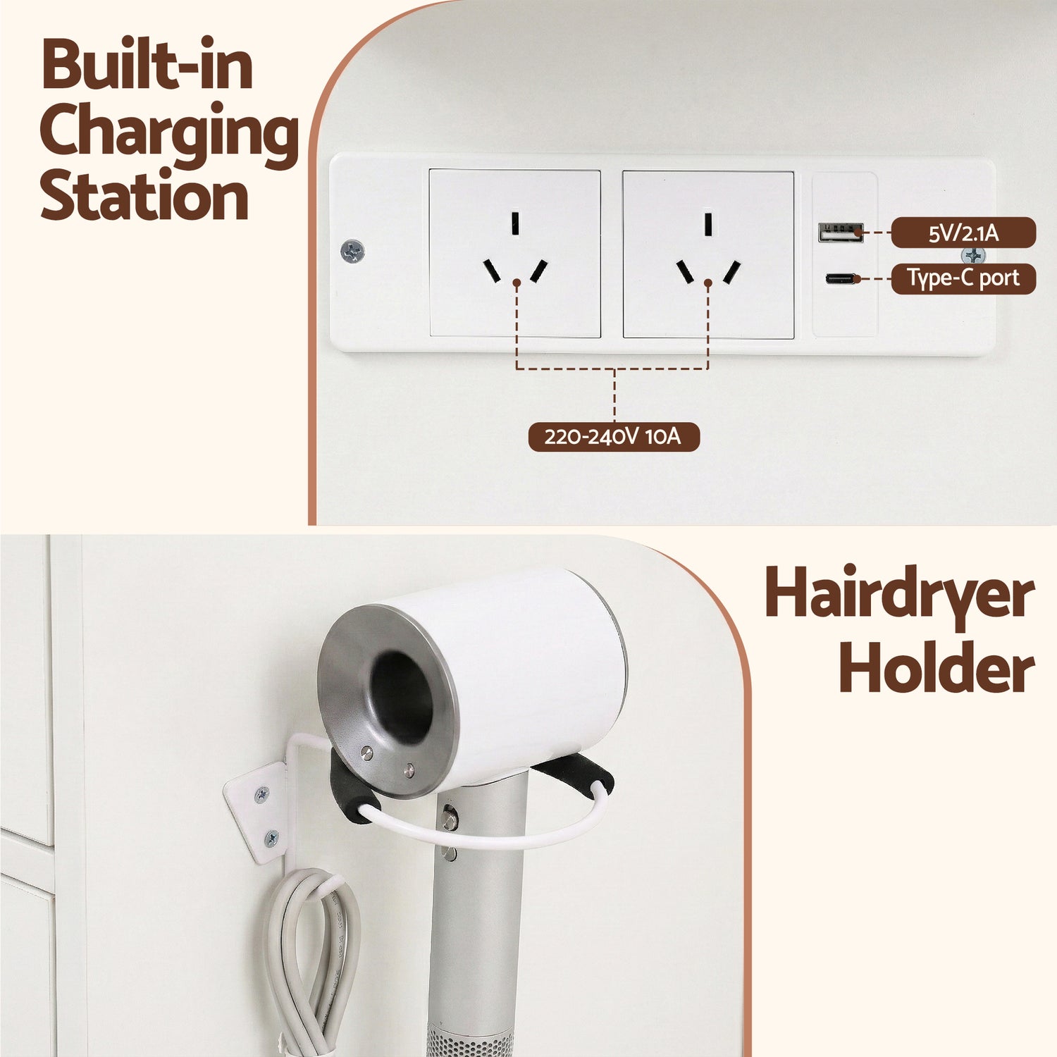 Designed for effortless organisation, it includes two smooth-glide drawers, open shelves, and a large cabinet with a height-adjustable shelf to neatly store all your cosmetics, accessories, and tools. The transparent desktop adds a touch of luxury, while the built-in charging station and hairdryer holder bring true convenience to your daily routine.