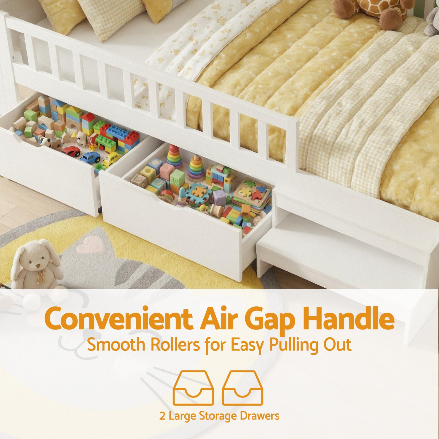 Maximize every inch of your kids room with our clever storage solutions. This single bed with storage features 2 large storage drawers and a spacious 31cm under-bed storage area, perfect for tucking away toys, linens, or clothes. It acts as a complete platform bed with storage, ensuring a tidy environment for any girl bed or boy's bedroom.