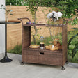 With a versatile and spacious design, this bar cart can easily transport kitchen utensils and delicious dishes. This trolley is made of poly rattan and is weather-resistant, and need less maintenance. It is suitable for daily use. The garden cart has a drawer to prevent food from falling on the ground. The powder-coated steel frame keeps the serving cart stable and sturdy. The handle on the top makes it easy to push and pull. Thanks to the smoothly-rolling castors, the trolley can be moved around effortlessly. Additionally, two of the castors have a lock function to prevent the cart from rolling away.