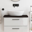 Are you planning to renovate your countertops at home? This wooden bathroom countertop is a perfect choice! Durable construction: This bathroom worktop is made of solid oak wood, which is a beautiful natural material. Oak wood has a medium brown colour and a dense grain, contributing to its unique look.Versatile applications: Besides a bathroom vanity top, this wooden countertop can be combined with different bases according to your needs. It can be used as a shelf, cabinet top, desk top, table top etc.Treated surface: The bathroom top has been treated with dark paint, so it is ready for use as an additional finish is not required.Handmade with live edge: This bathroom vanity countertop is handmade with a live edge. Due to that the knots, cracks, slightly curved shapes, and colour tones are part of the oak wood, every piece of oak countertop has its own unique character to display. The delivery is random. Good to know:As a natural product, wood may show knots and imperfections that we fill with black fillings to ensure a smooth appearance.