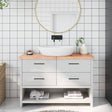 Are you planning to renovate your countertops at home? This wooden bathroom countertop is a perfect choice! Durable construction: This bathroom worktop is made of solid oak wood, which is a beautiful natural material. Oak wood has a medium brown colour and a dense grain, contributing to its unique look. Due to the hinge design, it can be folded and stored in narrow spaces.Versatile applications: Besides a bathroom vanity top, this wooden countertop can be combined with different bases according to your needs. It can be used as a shelf, cabinet top, desk top, table top etc.Treated surface: The bathroom top has been varnished so it is ready for use as an additional finish is not required.Handmade with live edge: This bathroom vanity countertop is handmade with a live edge. Due to that the knots, cracks, slightly curved shapes, and colour tones are part of the oak wood, every piece of oak countertop has its own unique character to display. The delivery is random. Good to know:As a natural product, wood may show knots and imperfections that we fill with black fillings to ensure a smooth appearance.