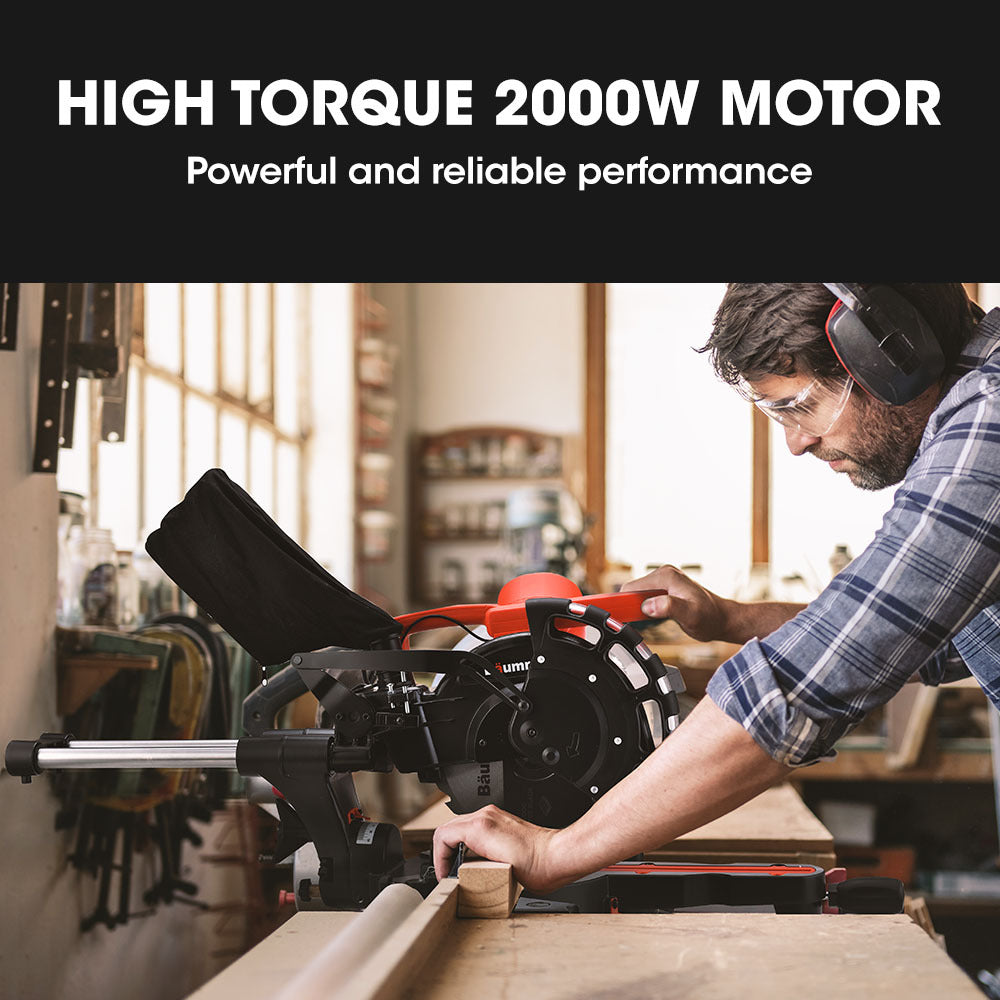 The Baumr-AG SBR-210 boasts a powerful 1500W motor. Spinning at 4500rpm it drives a 210mm tungsten carbide tipped blade for fine and perfectly flush cut. Paired with continuous sliding action on the double bearing rails allows you to perform large cross cuts with ease. The work table has positive stops on standard angles up to ±45 . The adjustable depth limiter allows the proper mitre, bevel, groove or Dado for complex compound cutting. The Baumr-AG even has a built-in laser guide for absolute precision!