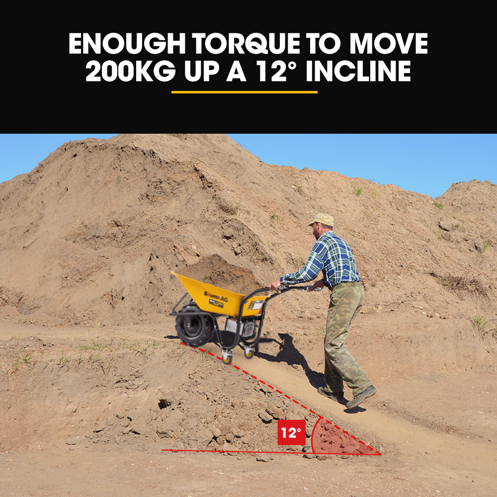 Experience the high productivity and low fatigue of the BPR-700E, making your tasks more efficient than ever before. Carrying heavy loads is a breeze with its impressive max load capacity of 260kg on flat ground and can carry 200kg up a 12° incline. Conquer any obstacle with confidence, whether you're on challenging terrain or traversing longer distances, this wheelbarrow makes it easy to handle all your material needs.