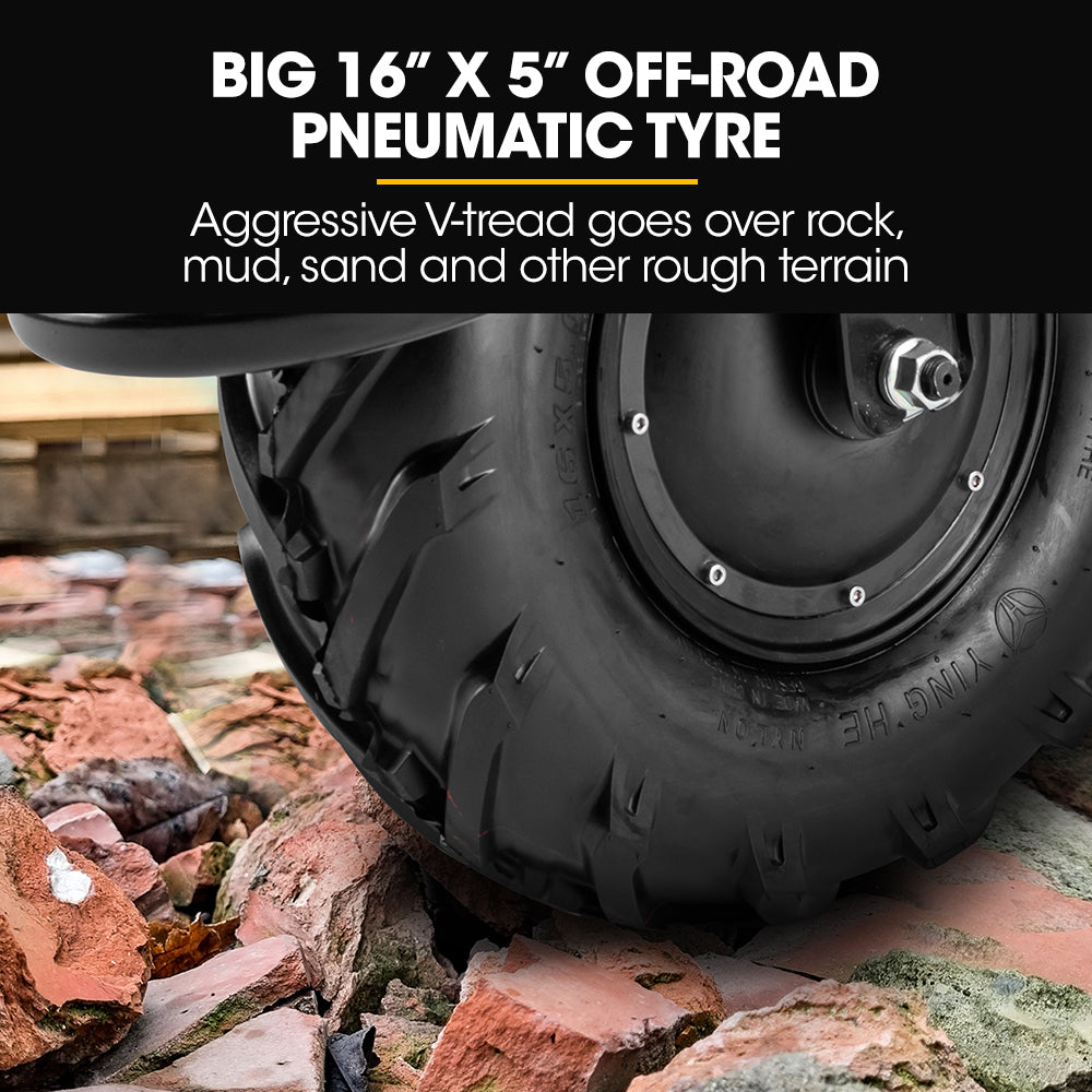 - Front Tire Size: 16 x 5 Inch Deep V-tread Pneumatic