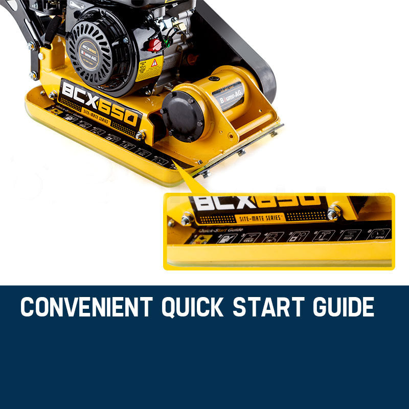 The full size 21" packer plate results in firm level grade soil compression backed by the 6.5HP engine. The huge 3.6L fuel tank ensures longer continuous operation, and the unit also features a removable throttle control to use on either side. With an impressive walk speed of 25m/min, it's easy to see why the BCX650 is the model of choice by tradespeople all over the country.