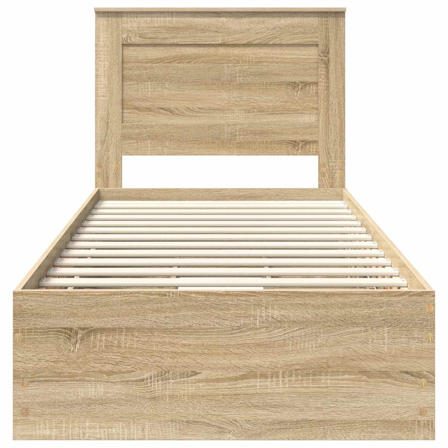 This Modern Bed Frame really steps up elegance with its sleek, minimalist design made for today’s homes. Its slender shape fits into any bedroom vibe seamlessly. Crafted mostly from engineered wood, this frame mixes style and durability, adding a touch of luxury while being practical. The fixed slatted base keeps your mattress steady, making sure you get a good night's sleep every time. Sturdy engineered wood: This bed frame is made from high-quality engineered wood, mixing style and durability. It stands up to wear and tear, looks great for ages, and supports standard mattresses comfortably. Built-in headboard: The headboard is crafted from the same engineered wood, giving a nice, cohesive look with the frame. It adds a touch of class while being comfy for sitting and reading. Secret hidden drawers: This frame has hidden drawers for extra storage. These clever compartments help keep things tidy, making it ideal for smaller spaces where saving room is a must. Modern design: With its focus on simplicity and functionality, this frame showcases square legs and clean lines, perfect for minimalist bedrooms. It's free-standing so you can place it anywhere. Easy maintenance: Keeping this bed frame looking fresh is simple. Just wipe it down with a damp cloth to remove dust. Made for indoors, it’s spot-on for any contemporary bedroom. Regular cleaning keeps it looking as inviting as the day you got it.
