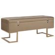Our velvet bench will surely make an eye-catching addition to your living room, hall or lounge. The beige velvet upholstery is soft to touch as well as highly cosy, giving a splash of colour to your interior. It has an interior storage compartment, which provides extra space to store your various items. Additionally, the powder-coated iron legs with a gold painting add the entryway bench's stability and durability. Our bench will enchantingly decorate your living space and be an indispensable part of your room. The velvet bench is easy to assemble.