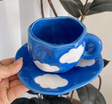 Blue Sky and White Clouds 300ML Underglaze Hand-Pinched Cup and Saucer Set - Ceramic Coffee Mug Milk Cup Breakfast Set