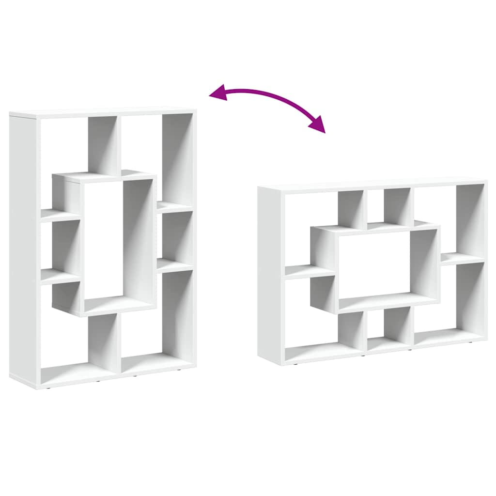 The contemporary bookcase blends a geometric shape design with storage, perfect for organizing your space with style! Stable and durable material: Engineered wood is a durable and stable material with a smooth surface that is resistant to moisture, warping, and splitting, making it a reliable choice for various projects.Ample storage: With compartments of varying sizes, this book case offers flexible storage options for items of different shapes and sizes.Flexible placement options: The shelving unit can be positioned with either its width or height on the ground, offering versatile room layout options.Versatile applications: The display shelf can also be used as a room divider, easily fitting into any style of room. You can place it in the living room to display decoration, in the study to store books and documents, in the bedroom to store everyday items, and in the basement to store bits and bobs.Easy maintenance: Thanks to its smooth surface, the book rack is easy to clean with a damp cloth and requires less maintenance. Warning:To prevent it from tipping over, this product must be used with the provided wall attachment device. Good to know:Screws and plugs for inside the wall are not included. We advise you to find and use screws and plugs suitable specifically for your walls. If you're not sure, you can consult with a professional. Please read and follow each step of the instructions.