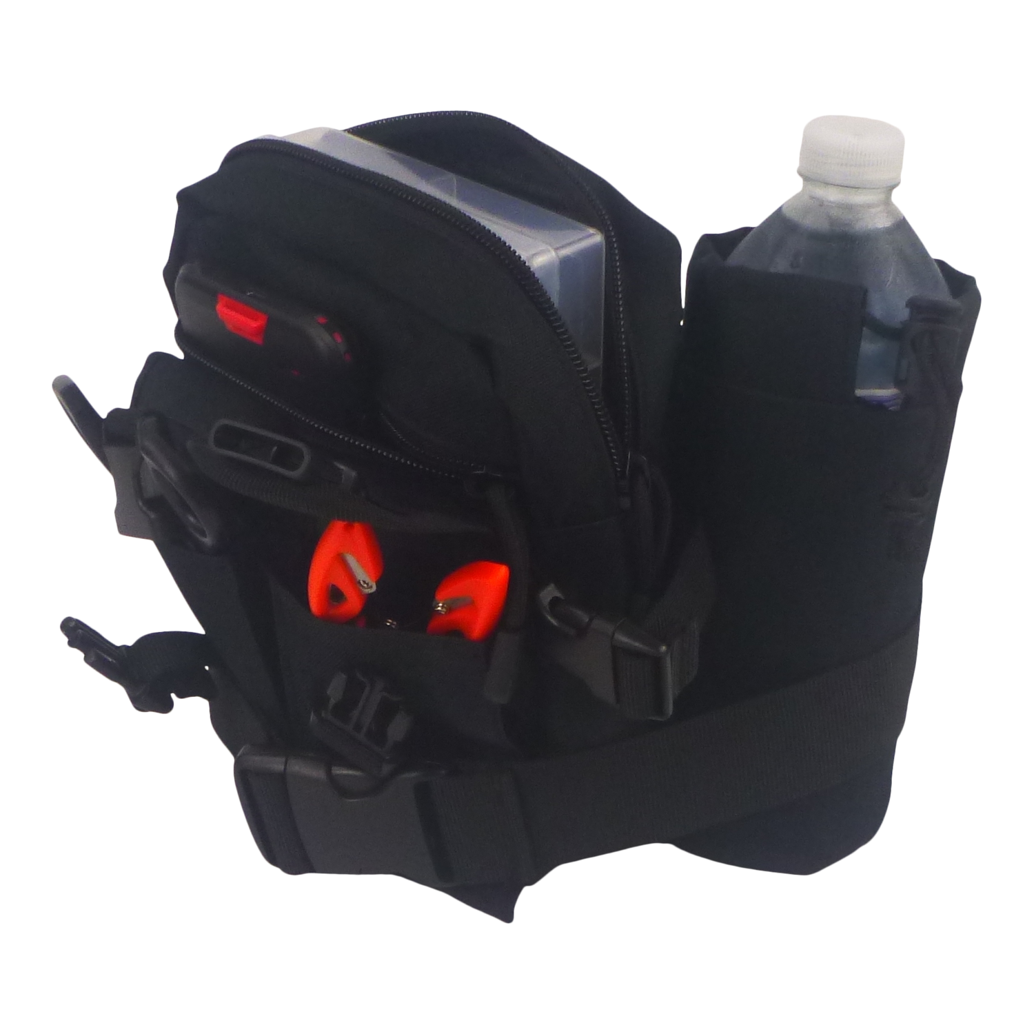 - Dedicated bottle pocket with restraining strap for hanging extra items.