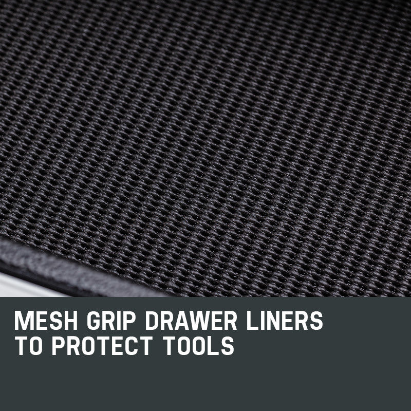 Both the cabinet and chest are built with high tensile powder coated steel enclosures. The top of the cabinet features an impact absorbent gripped surface to keep the chest secured firmly in place when mounted on top. Each drawer slides effortlessly in and out on smooth ball bearing rails, which makes finding and accessing each tool a cinch, and each drawer contains mesh grip liners to ensure your tools stay put when transporting. Both the cabinet and chest are easily transportable thanks to their side handles.