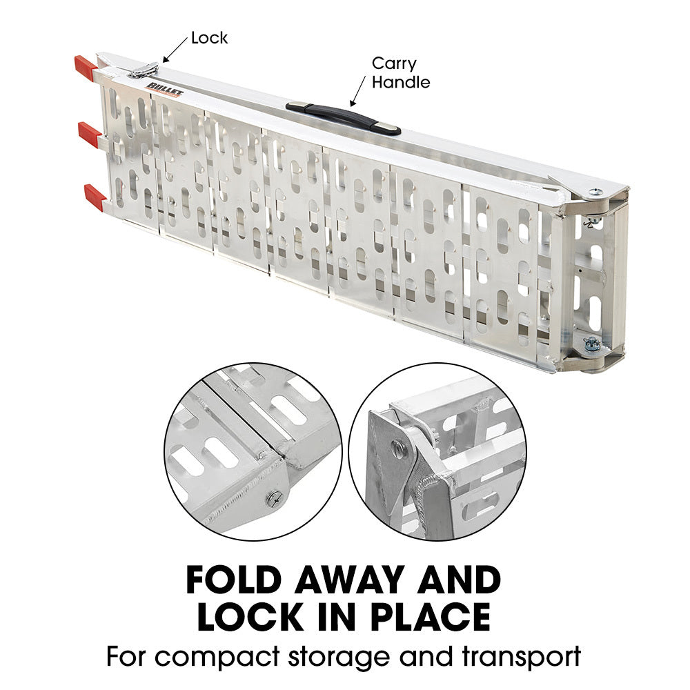 Watch out for light duty copies of this awesome product! With a huge 680kg total loading capacity, paint protecting slip resistant tips plus an ultra-convenient fold away design with lock and carry handle, Bullet Ramps are the ultimate choice for riders!