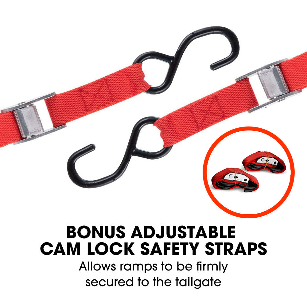 Bonus adjustable length safety cam lock straps ensure the ramps are firmly attached to the tailgate, while the anti slip design reduces the risk of vehicles rolling backwards. Making them perfect for safely loading a variety of two and four wheel vehicles and equipment.