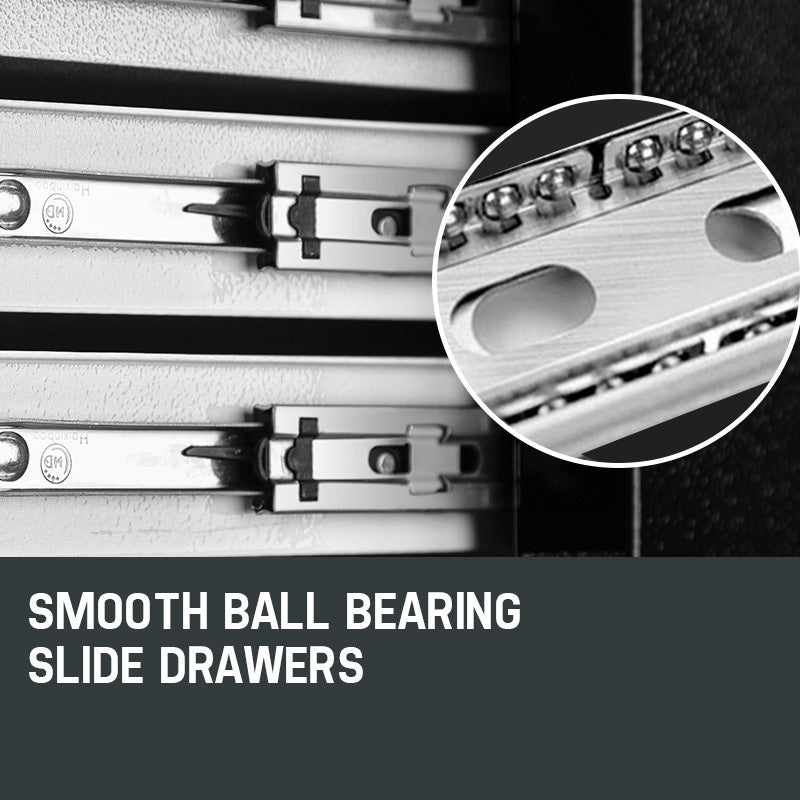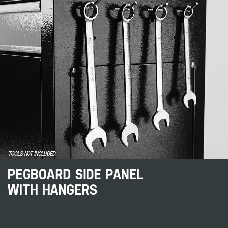 Both the cabinet and chest are built with high tensile powder coated steel enclosures. The top of the cabinet features an impact absorbent gripped surface to keep the chest secured firmly in place when mounted on top. Each drawer slides effortlessly in and out on smooth ball bearing rails, which makes finding and accessing each tool a cinch, and each drawer contains mesh grip liners to ensure your tools stay put when transporting. The cabinet also has a pegboard side panel with hangers and the chest is easily transportable thanks to its side carry handles.