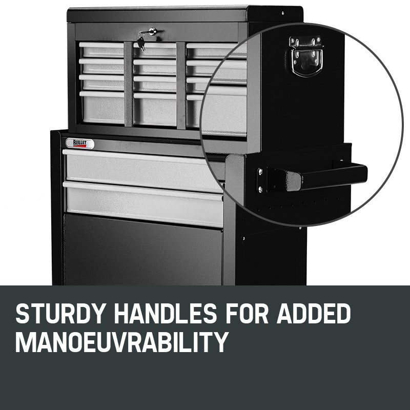 The New Bullet 8 Drawer Tool Box Cabinet is the ideal storage solution for all your tools, parts and hardware. Made with premium materials, this compact and maneuverable split unit is a must have for any garage or workshop. It provides a totally contained tool cabinet package designed to save you time, energy and make your work environment more manageable.