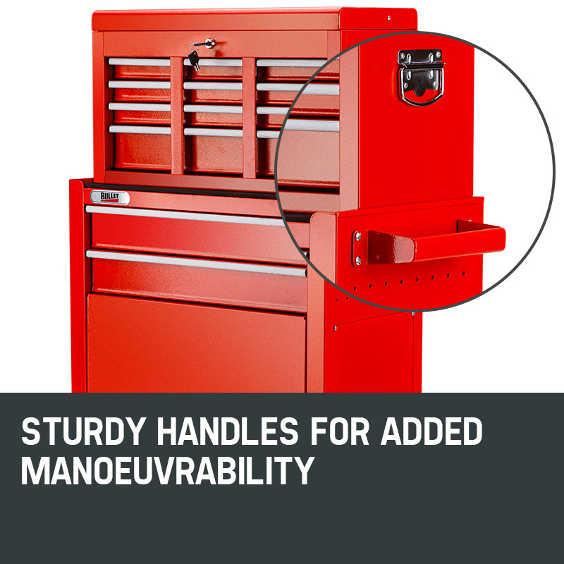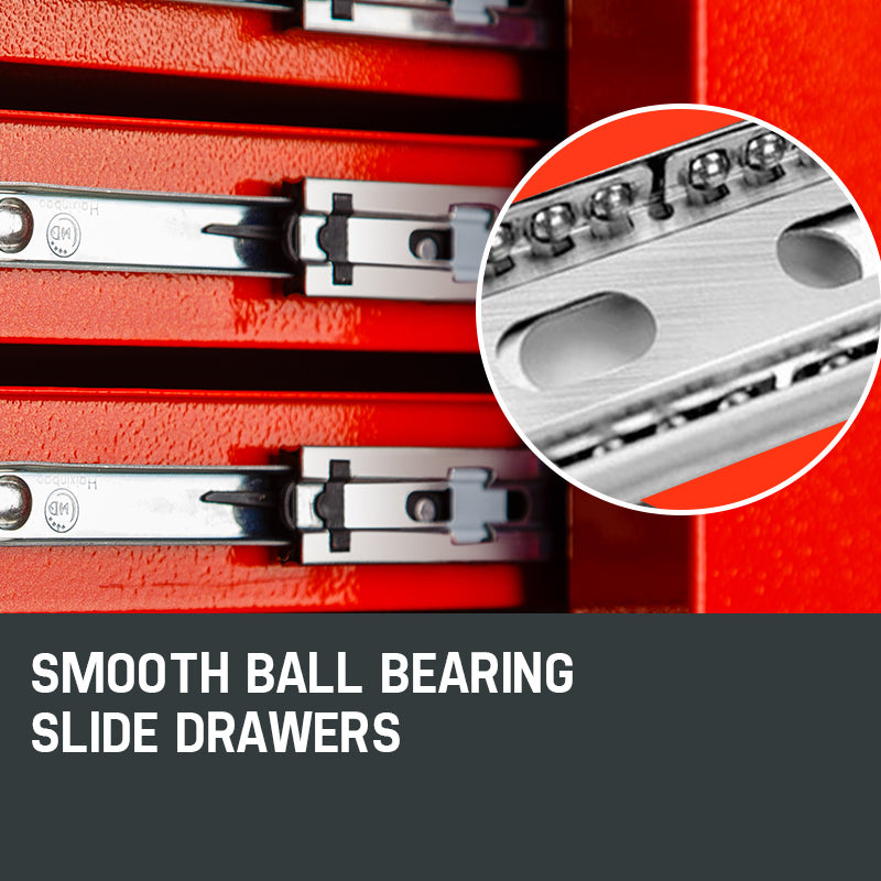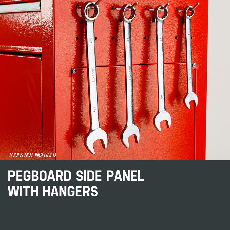 Both the cabinet and chest are built with high tensile powder coated steel enclosures. The top of the cabinet features an impact absorbent gripped surface to keep the chest secured firmly in place when mounted on top. Each drawer slides effortlessly in and out on smooth ball bearing rails, which makes finding and accessing each tool a cinch, and each drawer contains mesh grip liners to ensure your tools stay put when transporting. The cabinet also has a pegboard side panel with hangers and the chest is easily transportable thanks to its side carry handles.