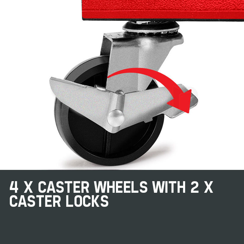 The Bullet 8 Drawer Tool Box Cabinet comes with a key lockable upper chest where valuable or often "borrowed" items can be stored. The drawers have varying depths and sizes to accommodate all types of equipment and parts. The lower cabinet features a self-contained key lockable door that stays open and out of the way for easy access to its contents. This space is large enough to keep a range of bulkier items. The cabinet sits on top of four caster wheels with 2 x caster locks, so you have the option to secure it in one place or move it with you around a workspace. This compact double unit fits discreetly in even the smallest spaces or storage areas and features a superior tubular cam-lock system for optimal security.