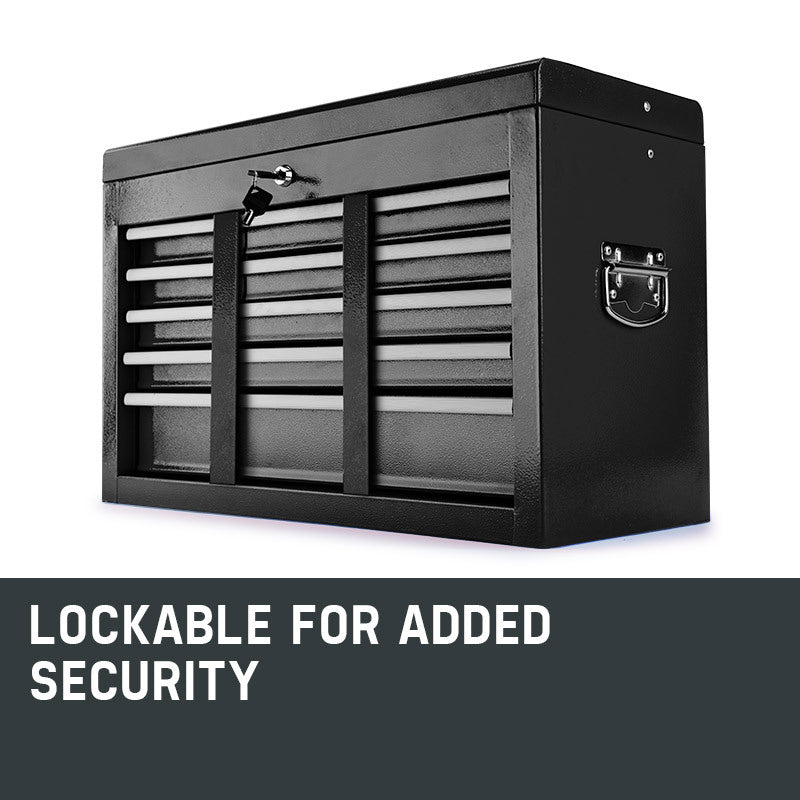 The drawers of the tool chest have varying depths and sizes to accommodate all types of equipment and parts. This compact unit fits discreetly in even the smallest spaces or storage areas. It features a superior tubular cam-lock system for optimal security, making it the ideal storage for valuable and often 'borrowed' items.