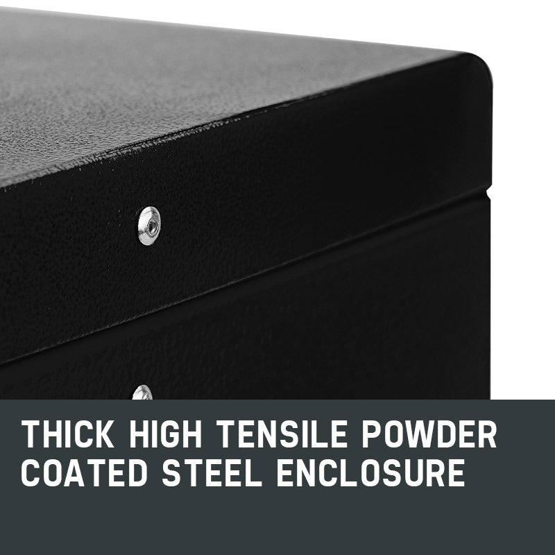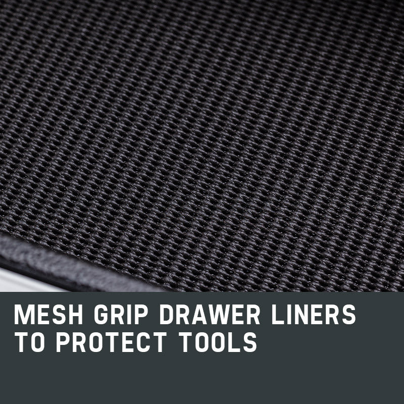The chest is built with a high tensile powder coated steel enclosure. Each drawer slides effortlessly in and out on smooth ball bearing rails, which makes finding and accessing each tool a cinch, and each drawer contains mesh grip liners to ensure your tools stay put when transporting. The unit is easily transportable, thanks to its side carry handles.