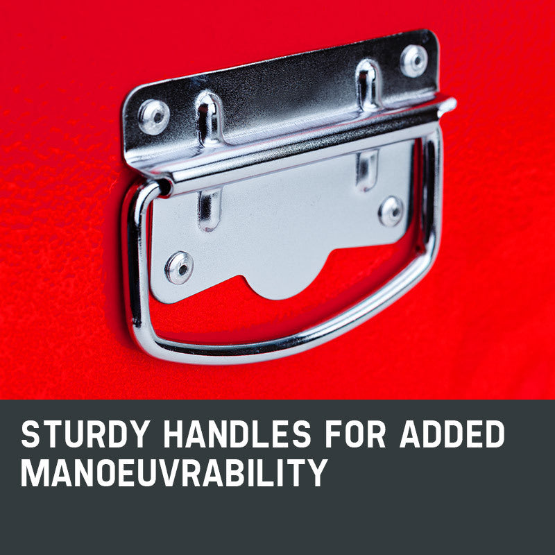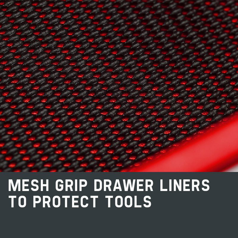 The chest is built with a high tensile powder coated steel enclosure. Each drawer slides effortlessly in and out on smooth ball bearing rails, which makes finding and accessing each tool a cinch, and each drawer contains mesh grip liners to ensure your tools stay put when transporting. The unit is easily transportable, thanks to its side carry handles.