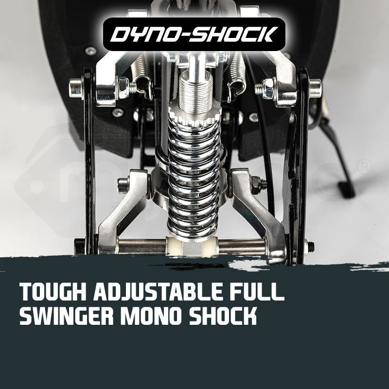 Of course, our boffins paid equal attention to the handling -a high-tensile yet lightweight steel frame houses tough polished steel shocks, massive disc brakes and oversized knobby 10-inch tyres. For those that like to tinker with their toys, you'll love how easy it is to tweak the shocks and brakes to your riding style.