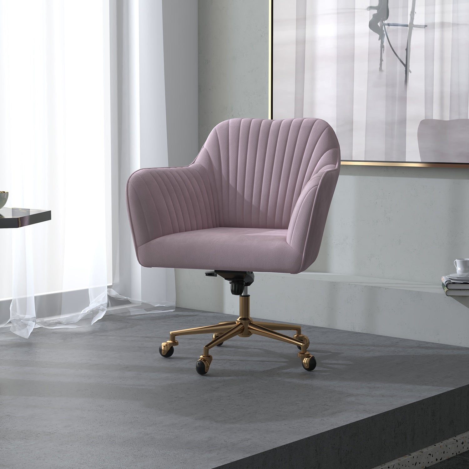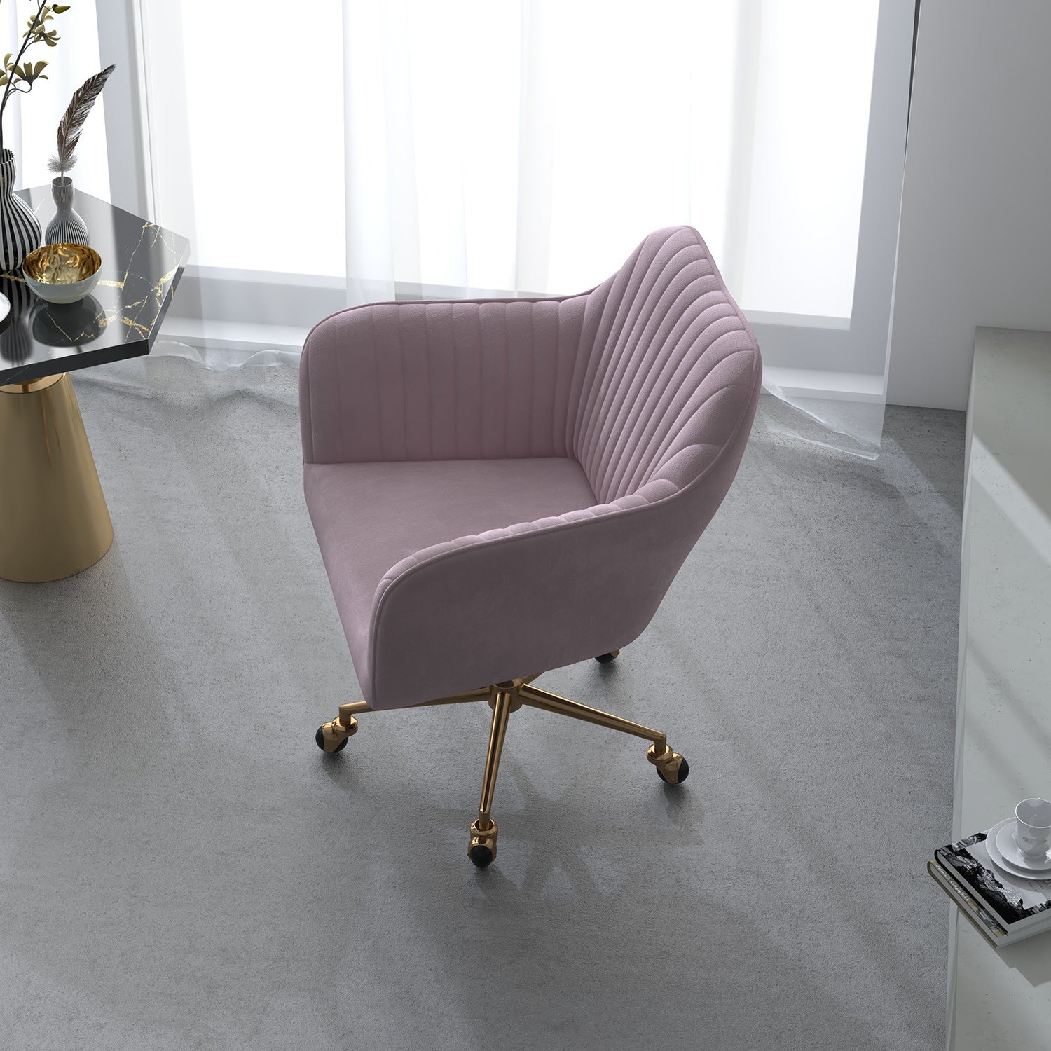 This blush velvet office chair easily complements various interior styles. For a cohesive look, consider the following décor palettes: