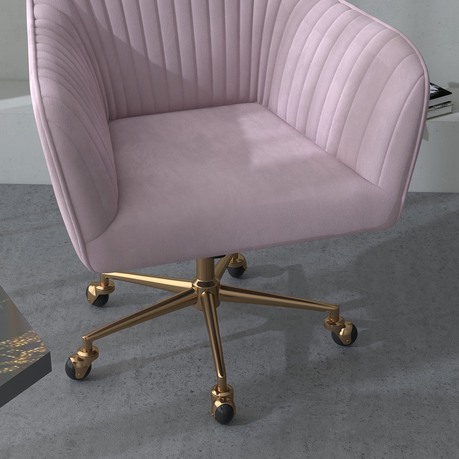 The chair stands out with its blush velvet finish, imparting a luxurious look without exceeding typical office chair costs. Its mid-back silhouette and swivel design feature meticulous attention to detail, ensuring that every curve and stitch accentuates both aesthetics and ergonomic support.