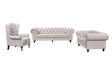 Introducing the Chesterfield Tufted Lounge - Beige, a timeless piece of furniture that will add a touch of elegance to any home. This sofa is upholstered in a luxurious beige fabric and features intricate button tufting on the back and sides. The cushioned seat and back provide ultimate comfort, while the zig zag springs and webbing offer support. The solid timber legs add durability, while the hardwood timber frame ensures longevity. This sofa is sure to become a focal point in any living room or lounge.