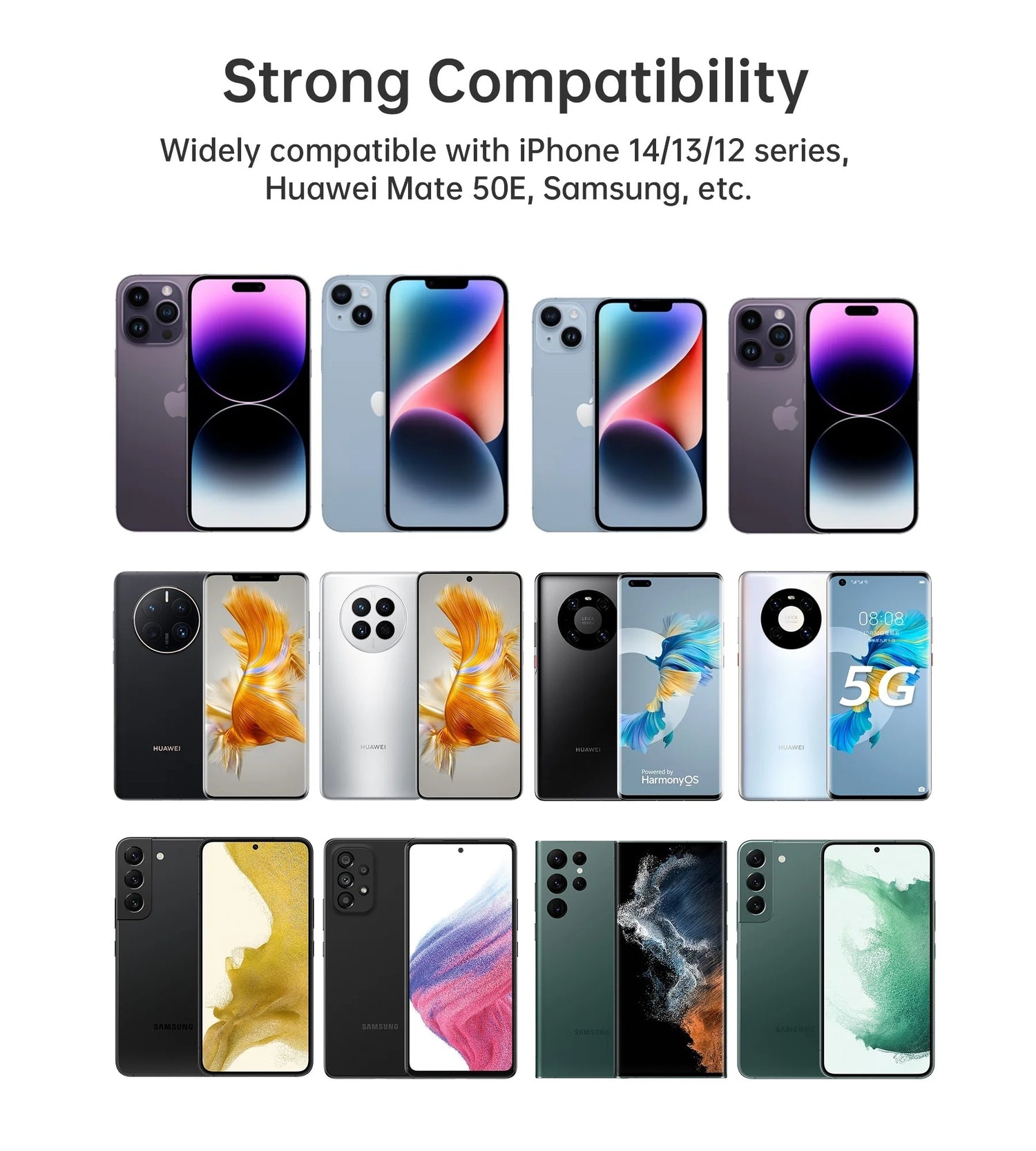 - Wide Device Compatibility: The power bank is optimized for a diverse range of mobile devices, including popular models like the iPhone Series 12, 13, 14, Huawei Mate 50E, and Samsung Galaxy S21, S22, S23.