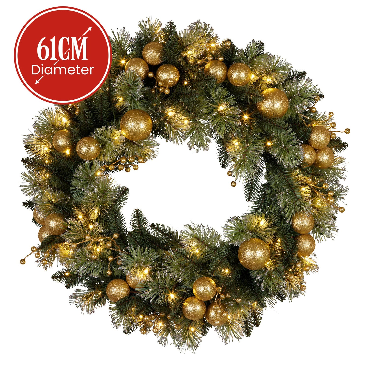 Christabelle 61cm Christmas Wreath Glittery Tipped with LED Lights and Golden Baubles Front Door Decoration Ornament