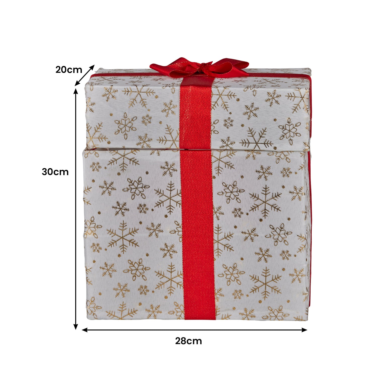 Add frosty fun to your holiday display with this animated white gift box. The lid lifts to reveal a jolly snowman popping up with festive cheer, while warm white LED lights cast a cosy glow. Perfect for brightening indoor spaces or covered outdoor areas, this playful decoration brings movement, light and a dash of winter magic to your Christmas celebrations.