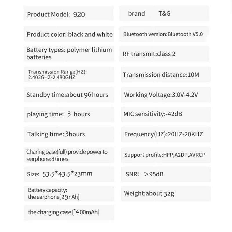 • 1 x TG Tg920 Tws Touch Control Earbud Hi-Fi Sound Quality Clear Durable Pop-Up Wireless Bluetooth 5.0 Earphone