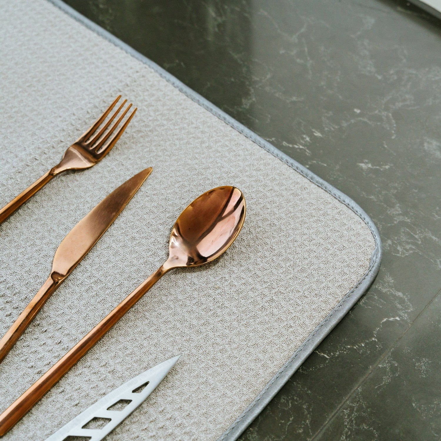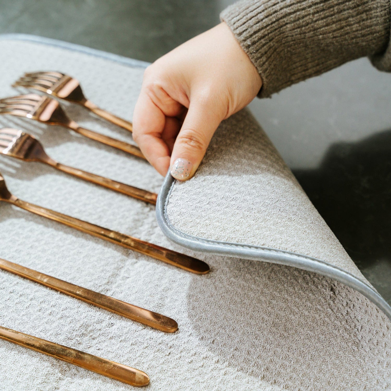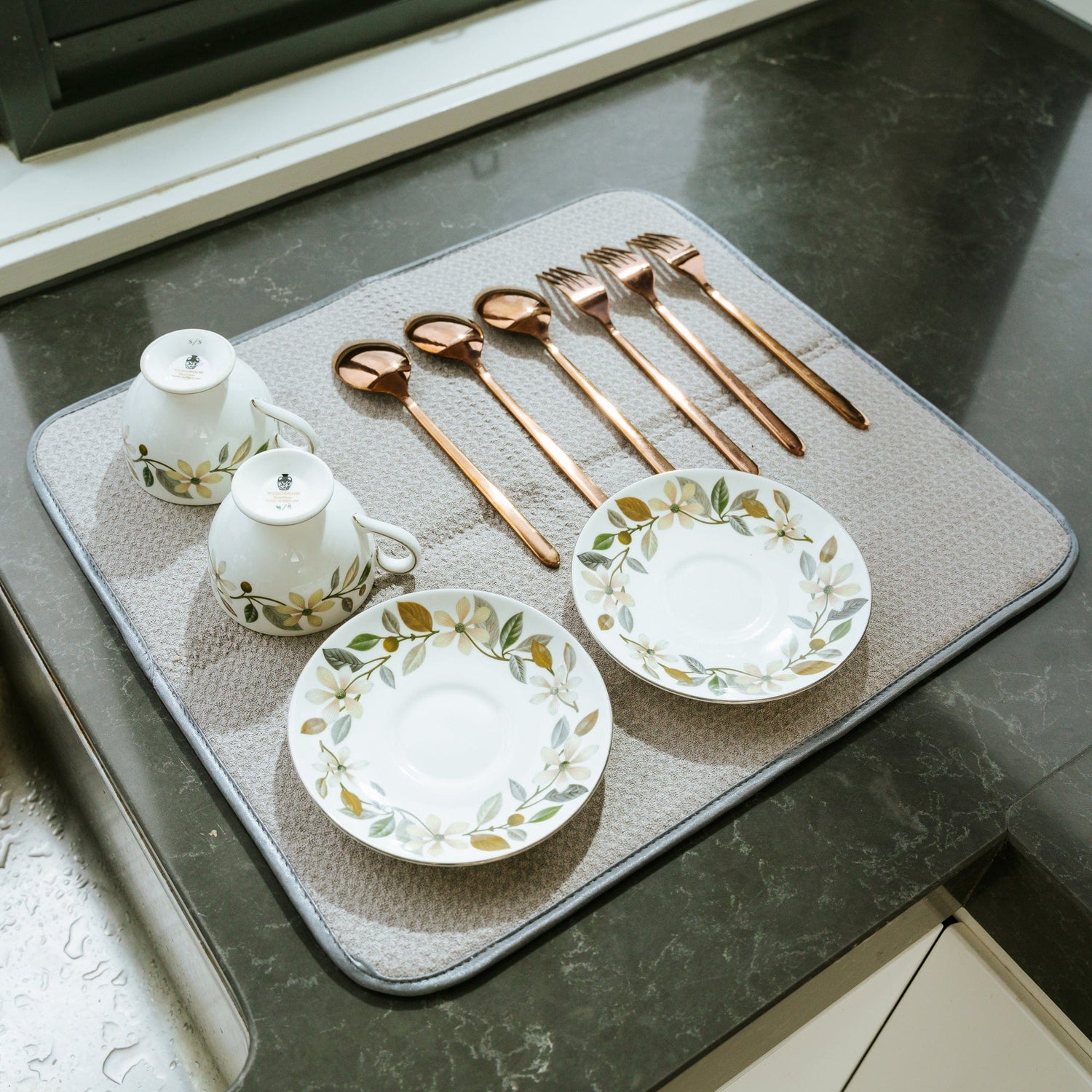The Dish Drying Mat fixes the age old issue of how to air dry bulky or fragile items after hand washing without leaving water all over benchtops. The laminated design combines a thin layer foam between two layers or super absorbent Eco Cloths. The Eco Cloths are four times more absorbent than cotton tea towels. The centre foam works to cushion delicate dishes and glassware.