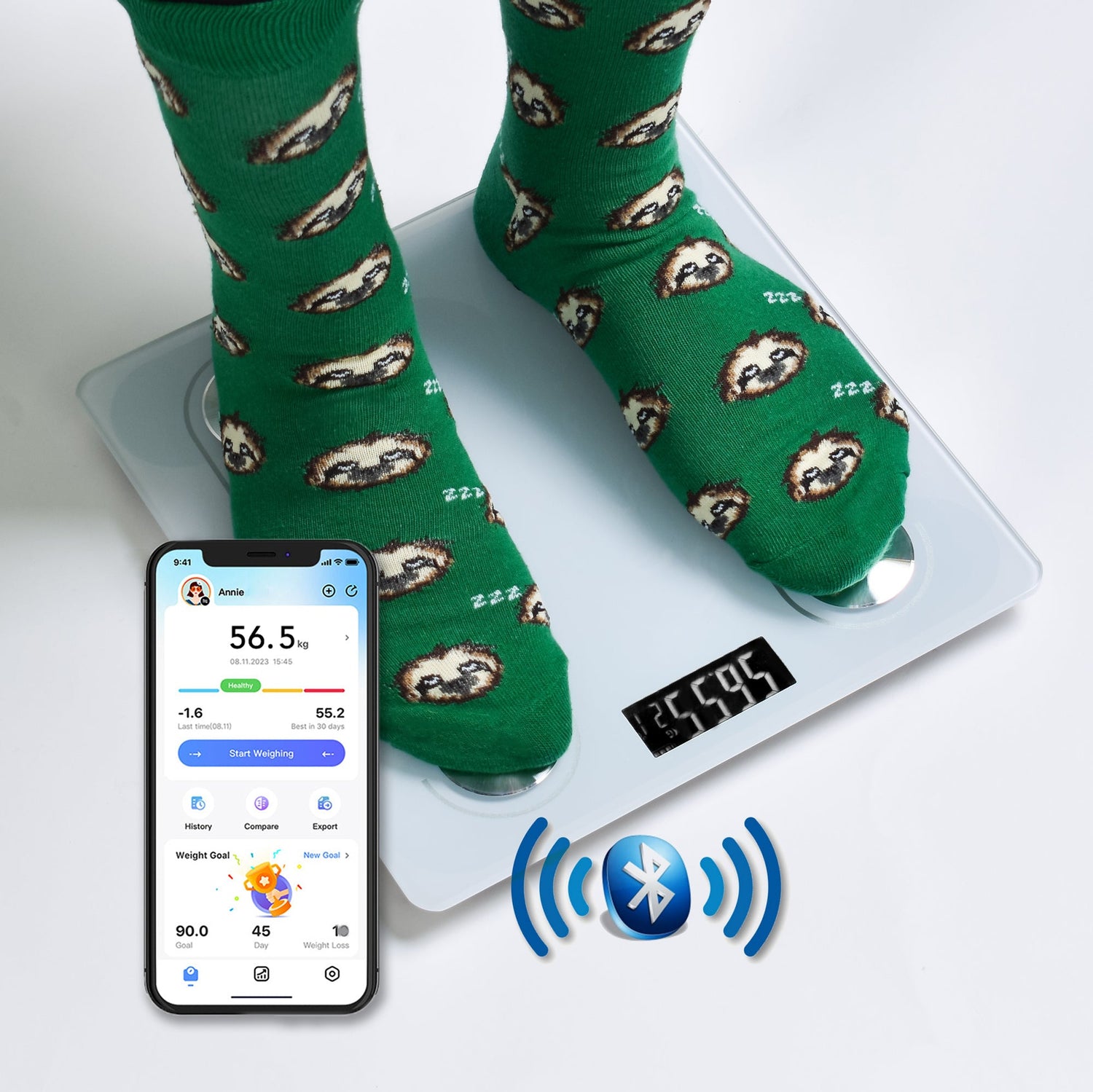 One-stop health tracking digital scale with smart bluetooth technology, allows you to upload your measurements to the corresponding APR that can be downloaded on iOS or Android Smartphone or tablet.