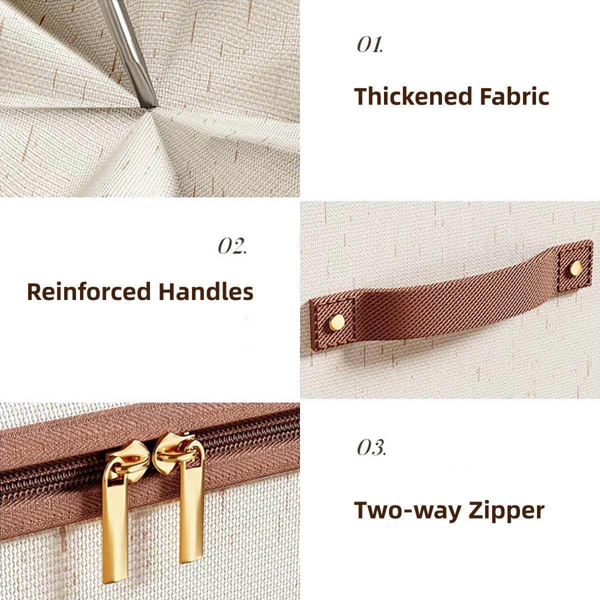 This large capacity clothing storage box is designed for convenience and neat organisation. Made from thickened cotton-linen fabric with built-in PP boards, it offers strong support and foldable storage. The covered design keeps items dust-free, while the dual zipper and reinforced handles make access and transport easy.