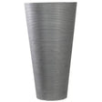 This tall round grey planter is made from exceptionally high-quality recycled materials that exceed the performance of most traditional pots and planters. The environmentally friendly round planter is the perfect choice for anybody wanting a low-maintenance planter for either indoors or outdoors that will last for years. Finished with a simply stunning textured lined surface youll absolutely love this super planter. There is a hole with a plug in the base to allow for drainage should you require.