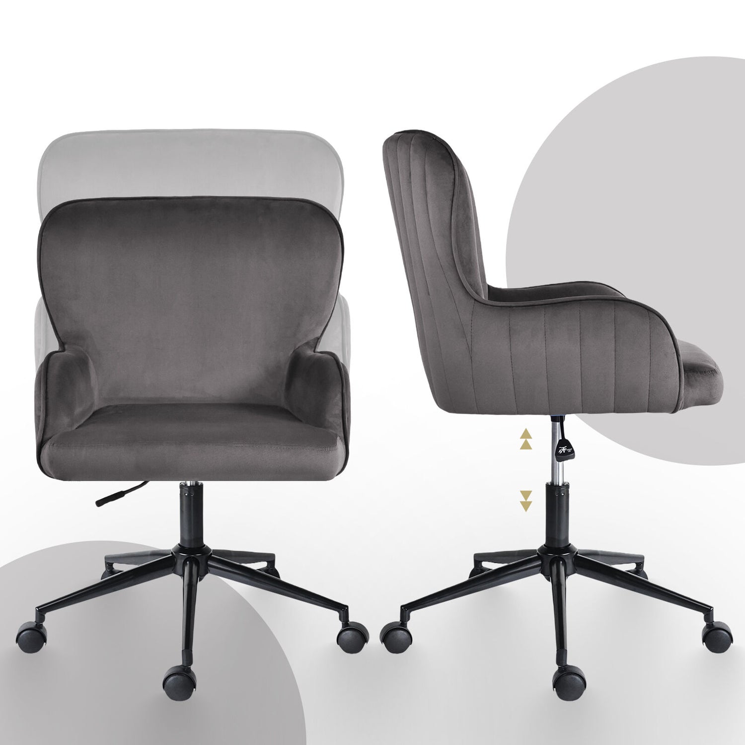 Blending soft curves with a smooth velvet finish, this chair offers both style and comfort. The cushioned seat and contoured armrests support you through work sessions, study hours or quiet breaks, while the swivel base and height adjustment keep you sitting just right.