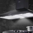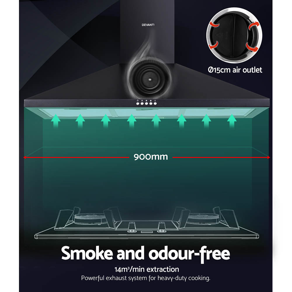 Say goodbye to smoky fumes and unwelcome cooking odours with our Devanti Range Hood. With its high-performance motors, the black powder-coated steel range hood provides a steady upflow and filtered extraction of fumes and oil to keep your cooktop area clean and fresh after every use. With its 3-speed rocker button switches, the extraction speed can be adjusted to suit the circumstances. Other features include three non-stick 5-layer aluminium filters that are removable and replaceable and LED lighting to facilitate your illuminated cooking. The range hood is wall mounted and the chimney can be adjusted to fit the installation space.