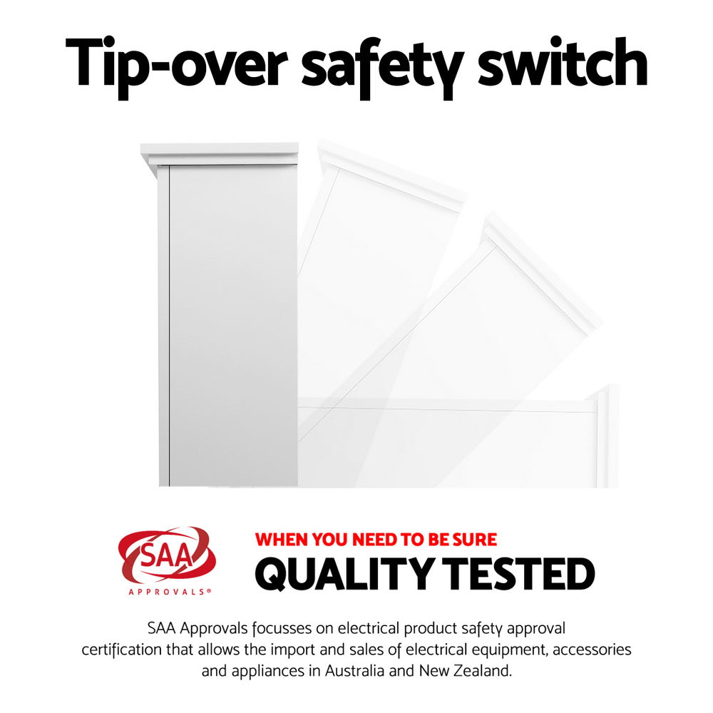 Old world charm with a modern touch. The Devanti Electric Mantel Fireplace delivers dazzling warmth with radiant glows. With its classic design, the mantel fireplace captures the mood of a traditional fireplace with a contemporary update. More importantly, the aluminium heating elements actually helps to maintain natural humidity in the air for comfortable heat without drying out the room air. The heater heats up rapidly and uses over 90% less energy than gas for better costs savings. Good all-round heating is also ensured with the fan-assisted heated air circulation. And if flickering flames are a must, our fireplace provides a 3D flame effect with glowing embers for a totally authentic presence. Constructed of MDF board with a black tempered glass casing, the fireplace is strong and durable. Convenient adjustments from the handy remote control include high/low heat settings, nine-hour timer setting and thermostat for the desired warmth and ambience. The fireplace features overheating protection, auto shut-off and no worries about carbon dioxide emissions, odours or fumes from traditional fireplaces.