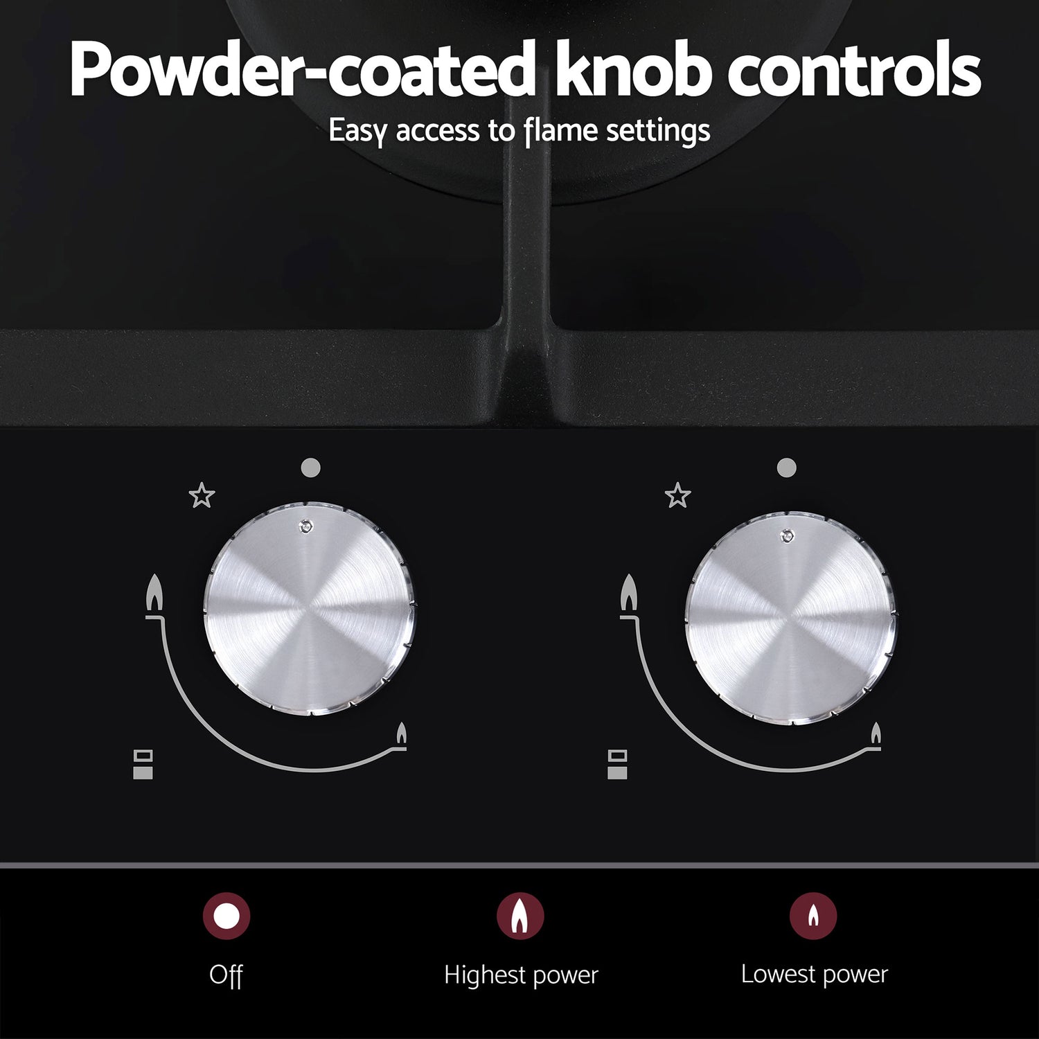 Safety is a priority with the integrated Flame Failure Device (FFD), which automatically cuts gas flow if the flame goes out—meeting essential Australian standards for homes and rentals. The sleek 8mm black tempered glass surface offers a premium look and is effortless to clean, while the heavy-duty cast iron trivets ensure maximum stability for your cookware.