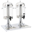 This juice dispenser is a sophisticated solution for serving chilled juice or other beverages at buffets, barbecues and other events. The two juice containers have a capacity of 8 L each. The drink dispenser with taps is suitable for glasses with a maximum height of 15.5 cm. The central cylinders can be filled with ice cubes for cooling the drinks. The drip trays collect any spilt juice and can be easily taken out and emptied. The double beverage dispenser has a stainless steel frame and transparent plastic containers, making it durable and easy to clean.