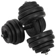 This ergonomic dumbbell set has a total weight of 30 kg (2 x 15 kg). The dumbbells have anti-slip plastic handles so you will be able to work-out without having to worry that the dumbbells will slip from your hands and fall. The screw-caps have star bolts to make sure that the weight plates are always mounted firmly and secure on the bar. The bar of the dumbbell is made of strong metal. The grip surface is approx. 14.5 cm. The weight plates are covered with robust, floor-friendly plastic, which allows you not to experience any annoying clanging sounds of the weights.