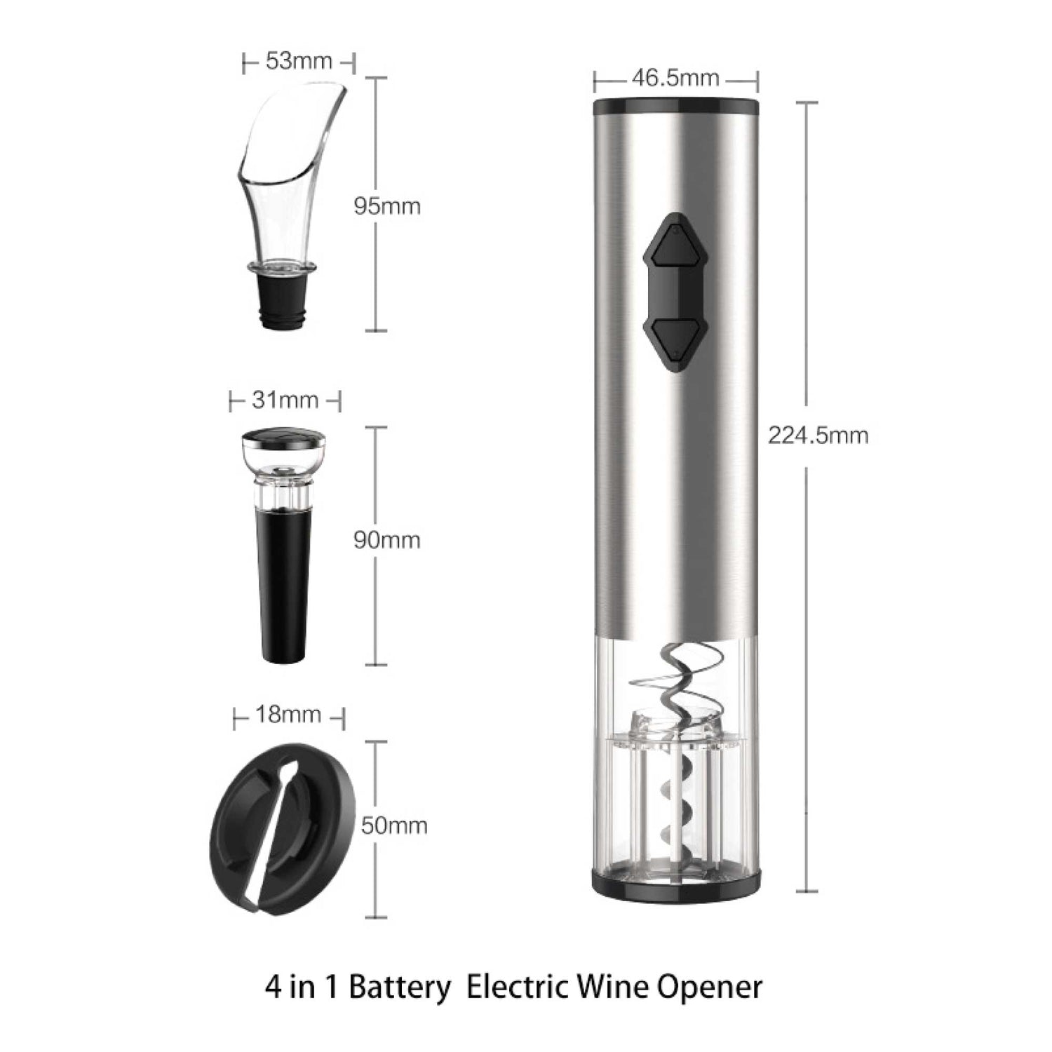 - Electric Opener: Suitable for corks with a diameter between 20-24 mm and cork height 44mm.