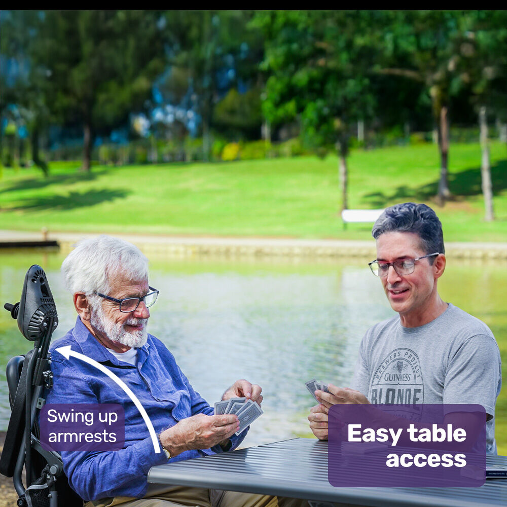 Getting on and off this Equipmed Power Wheelchair is easy thanks to swing-up armrests and the swing-up footrest. The retracting armrests also give you the option of dining at a table.